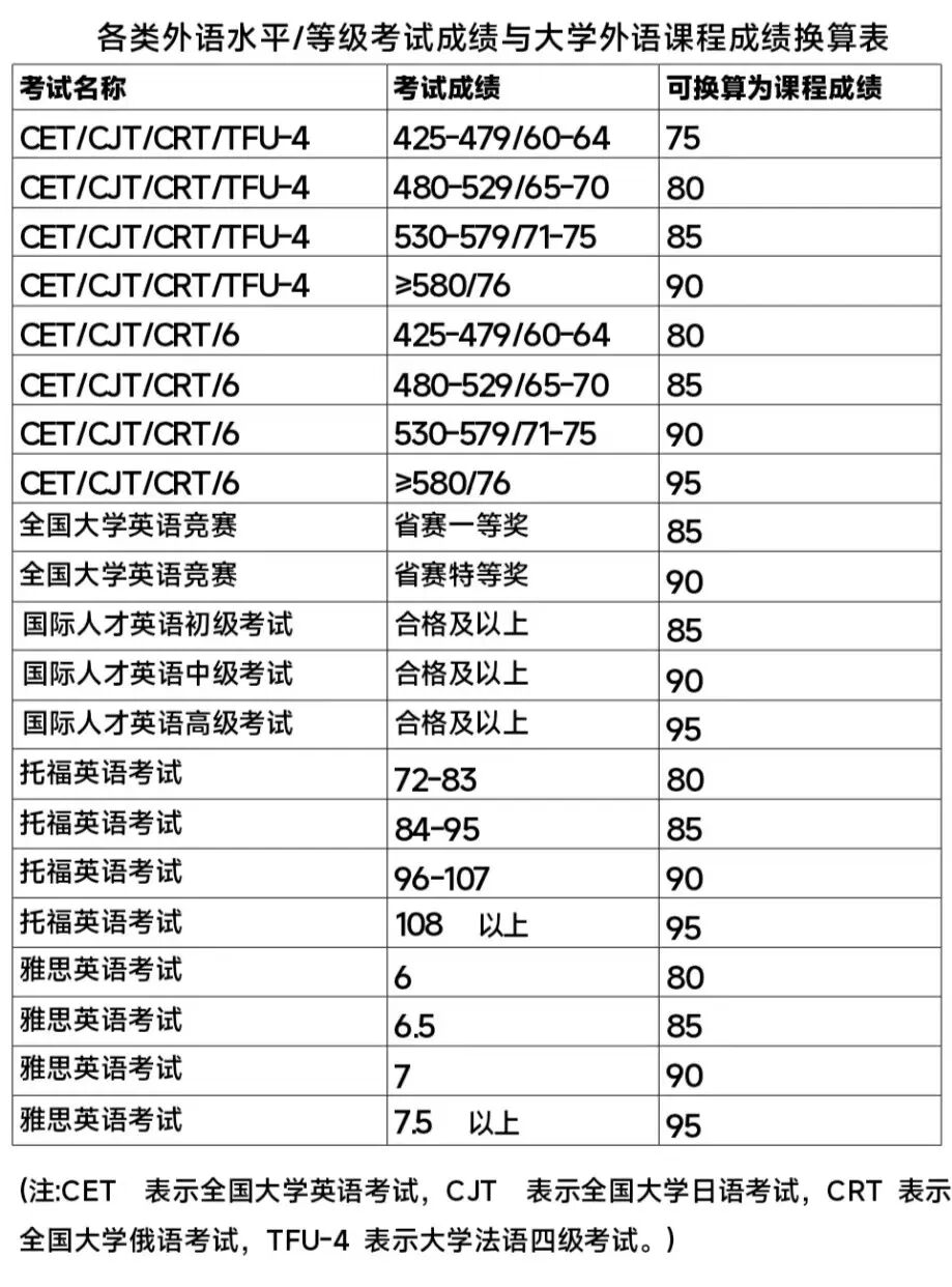凭各类外语考试/竞赛获免修资格的,免修课程成绩按统一换算标准直接核定(如四级425-479分换算75分、六级≥580分换算95分、大英赛省赛特等奖换算90分等),不同考试成绩按高档成绩记载。