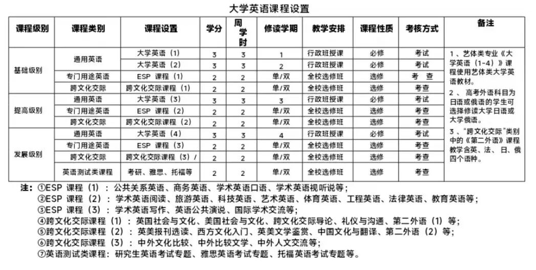 全体适用学生统一修读基础级别通用英语课程,打牢英语基础。