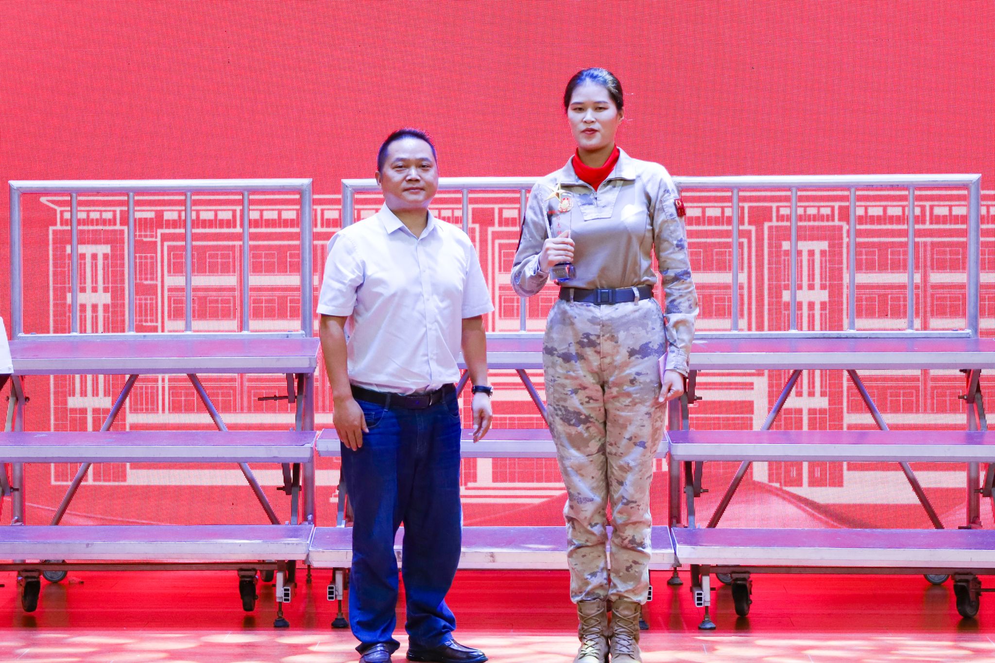 伟德victor1946党委书记徐华胜为老生代表93阅兵参与者、商务英语2023级1班谭宁颁发“伟德victor1946励志担当楷模”荣誉称号,以此表彰其优秀表现,并激励全体学生见贤思齐。谭宁用“坚持”“团结”“担当”三个关键词分享了她五年的军旅生涯和50余场国家级仪仗司礼任务,鼓励同学们将对祖国的热爱,化作日常学习生活中的不懈动力。