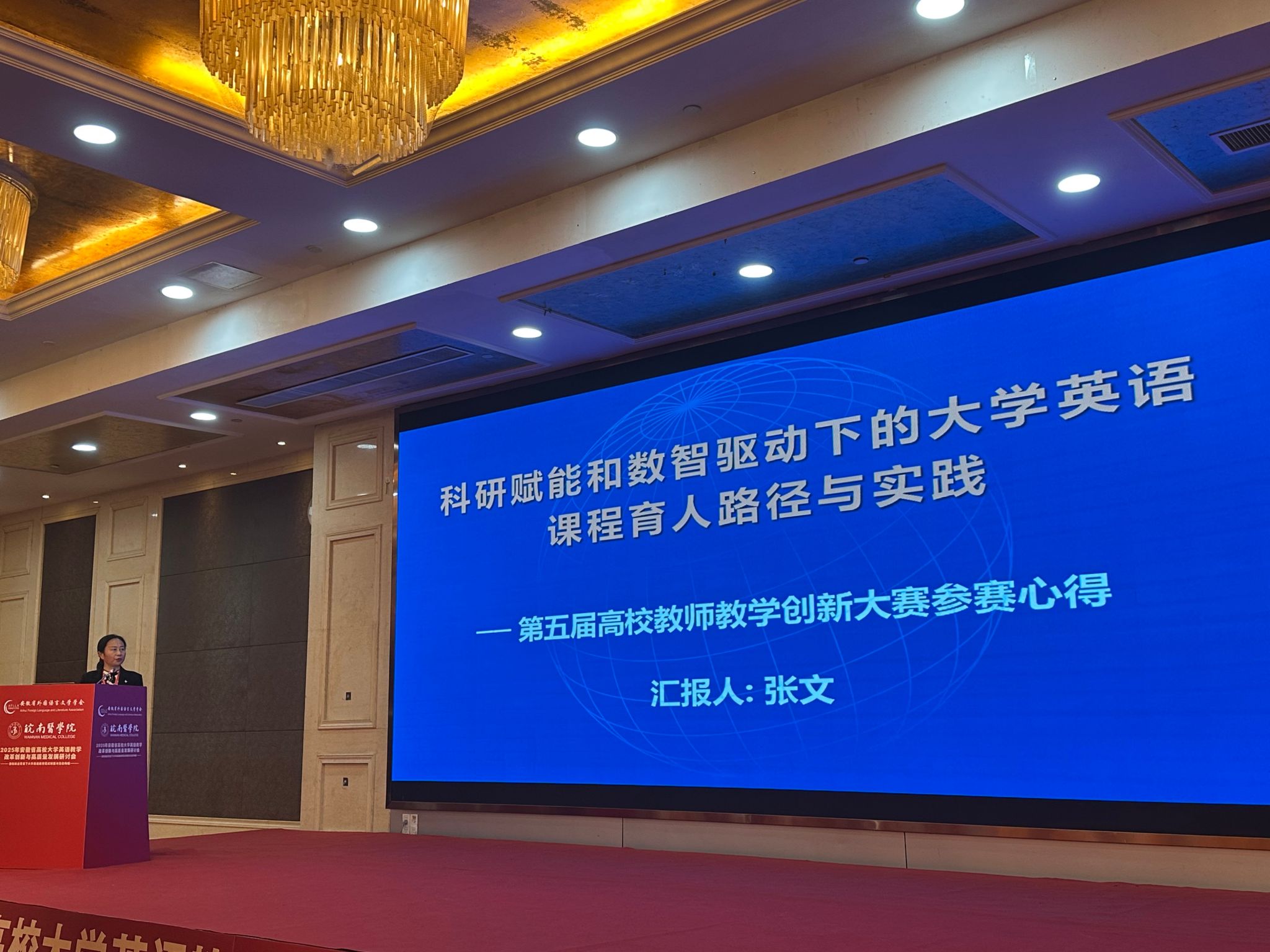 11月28日至30日,2025年安徽省高校大学英语教学改革创新与高质量发展研讨会在芜湖举行。本次研讨会聚焦AI时代大学英语教学改革与创新路径,汇聚了南京大学、浙江大学、南京师范大学等省内外高校的100余位专家学者与教学名师。伟德victor1946王先荣教授(安徽省大学英语教学工作委员会主任)、副院长瞿宁霞及大学英语教研室主任受邀参会。其中,大学英语第二教研室主任、第五届全国高校教师教学创新大赛安徽赛区一等奖获得者张文教授,应邀作题为《科研赋能与数智驱动下的大学英语课程育人路径与实践》的交流报告。