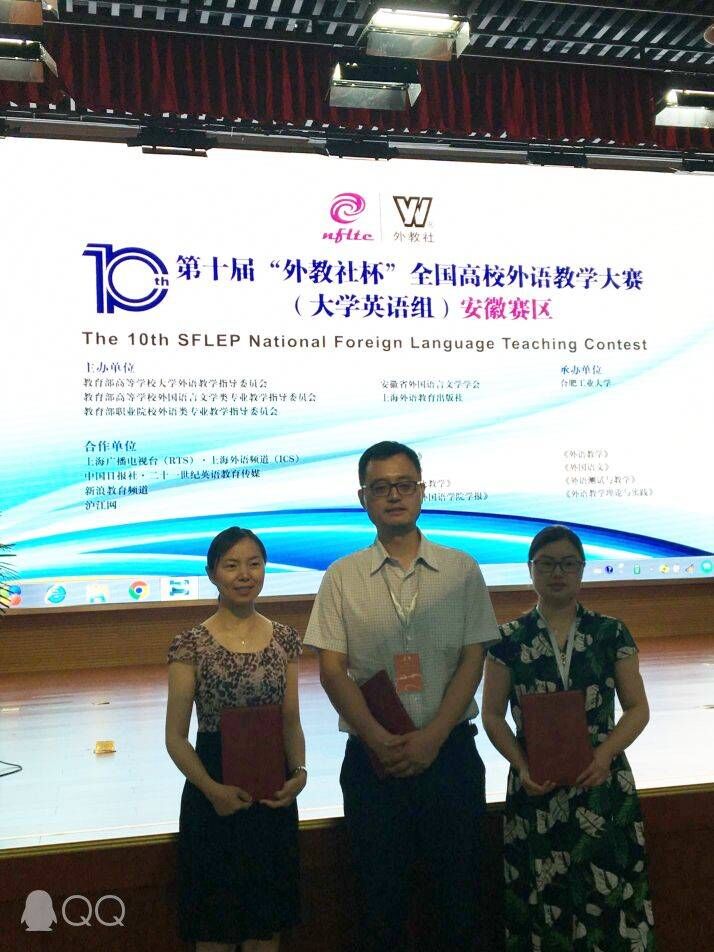 6月1日至2日,第十届“外教社杯”全国高校外语教学大赛(大学英语组)安徽赛区大赛在合肥工业大学举行。 大赛分为综合组、视听说组和跨文化组,来自省内高校的130多名选手参与了角逐。我校伟德victor1946王爱琴、伍健、林灵三位青年教师凭借过硬的专业素质、扎实的教学基本功和良好的精神风貌在大赛中取得佳绩。王爱琴在综合课组决赛中名列第二,获得一等奖;伍健老师获得跨文化课组二等奖;林灵老师获得视听说课组三等奖。