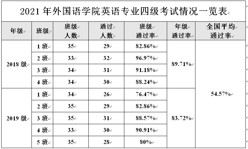 近日,2021年全国高校英语专业四级考试(TEM4)成绩揭晓,伟德victor1946英语专业2018级136名同学和2019级172名同学参加考试,一次性通过率分别为达89.71%和83.72%,分别超出全国平均通过率(54.57%)近35和30个百分点,其中2018级英语(2)班33位同学仅1人未通过,班级通过率高达96.97%,在近年来我院英语专业四级考试成绩屡夺佳绩的基础上再创历史新高,充分展示了我院英语国家级一流专业建设的成果。