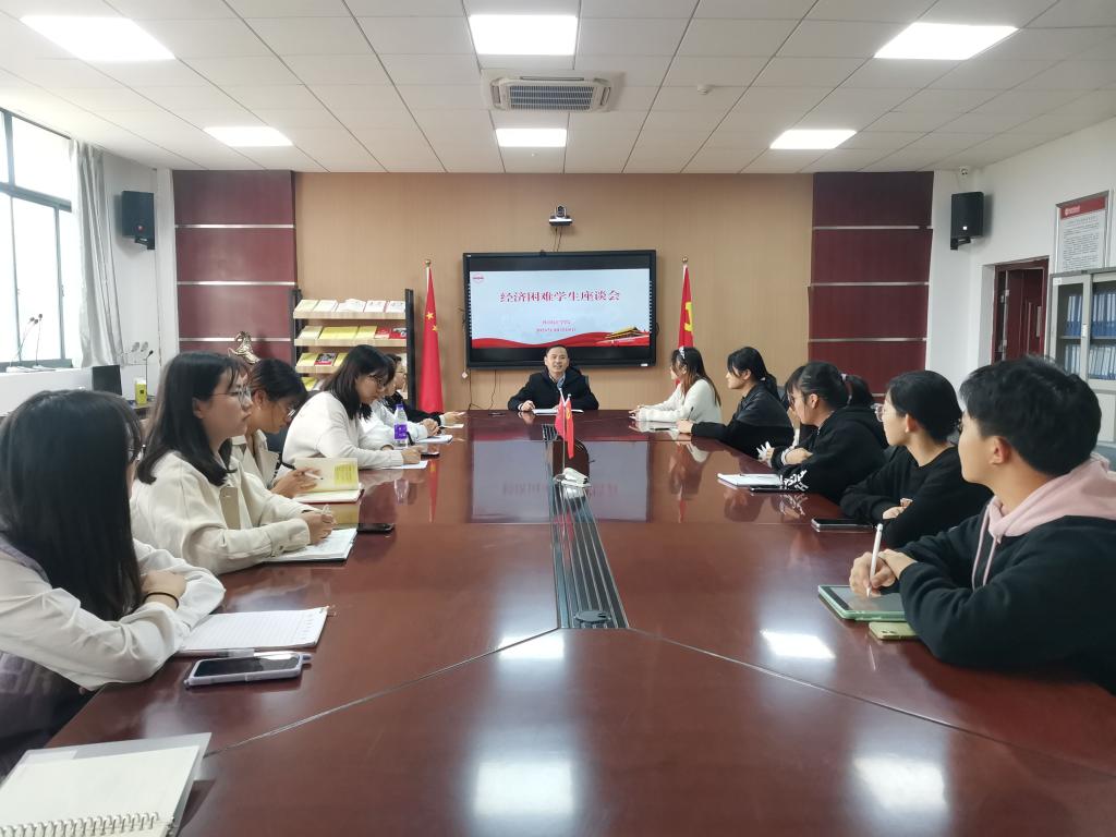 2021年10月18日中午,伟德victor1946在E304召开经济困难学生座谈会,学院党委副书记夏斐、辅导员老师、部分经济困难学生参加了会议。