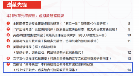 近日,外语教学与研究出版社出版的《外研之声》2022年第一期“改革先锋”专栏在全国范围内遴选了7个虚拟教研室建设案例进行推介,我院王先荣教授领衔组建的“安徽省‘高师联盟’本科高校英语教师教育课程虚拟教研室”为入选案例之一。