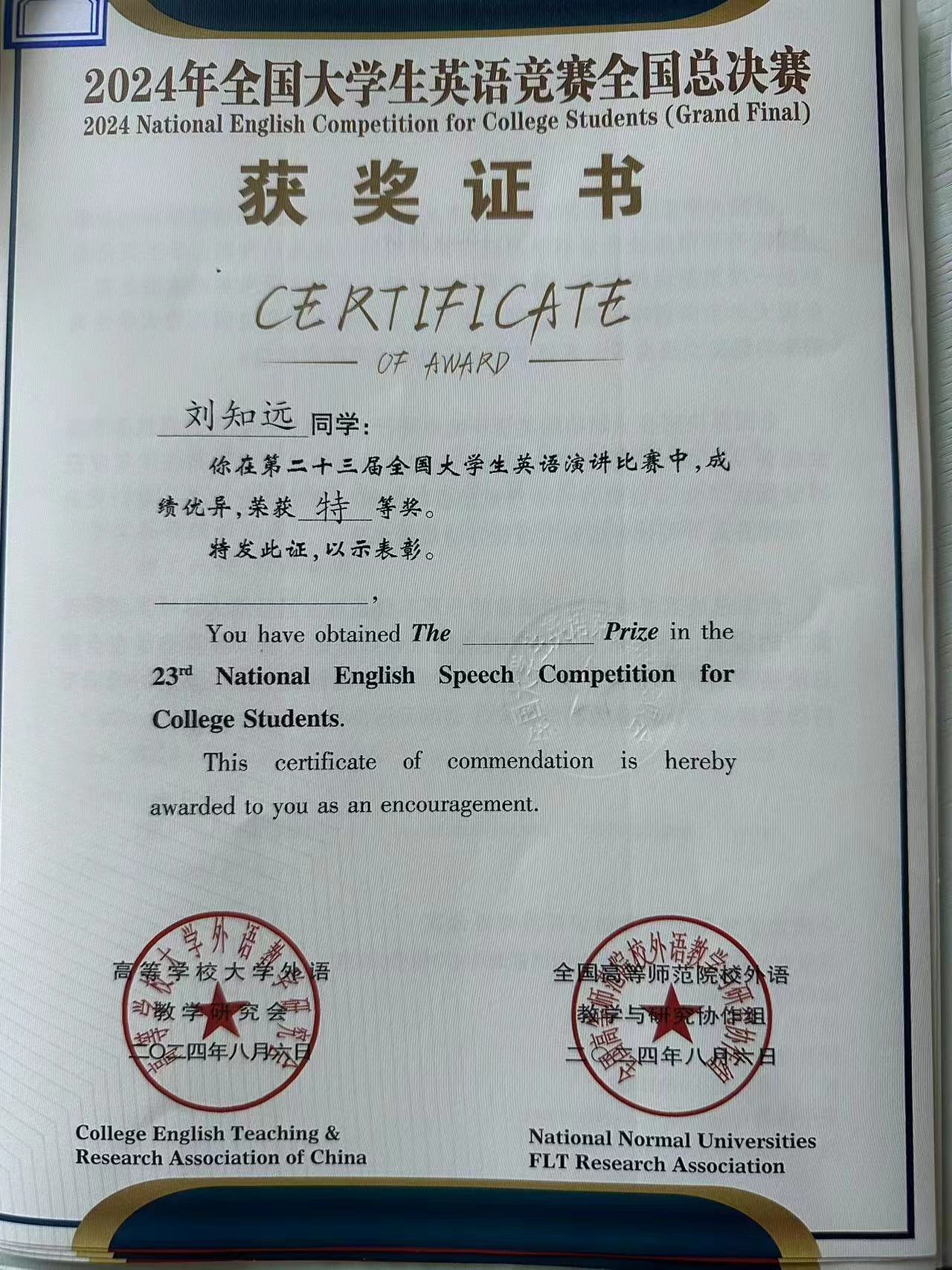 8月2日至8月6日,2024年全国大学生英语竞赛(NECCS)全国总决赛在广西桂林圆满落下帷幕。经过预赛和决赛的激烈角逐,我院英语专业2021级刘知远同学荣获英语演讲比赛全国特等奖,英语辩论赛全国一等奖和英语风采大赛全国二等奖,同时获得优秀参赛选手称号和最佳个人表演奖。指导教师毛慧获得国赛优秀指导教师称号。