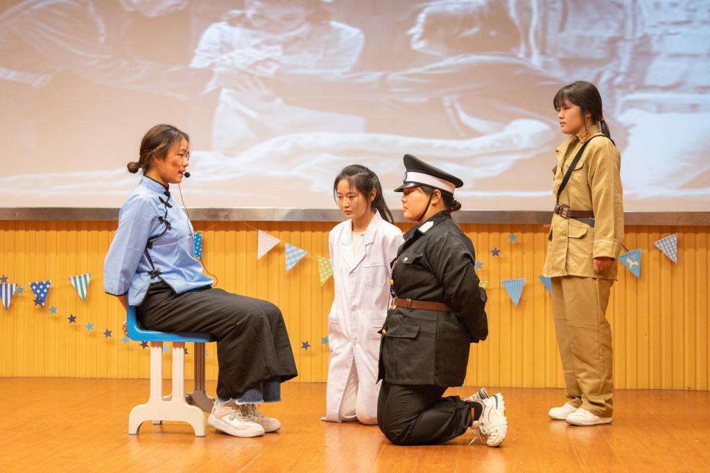 狱中绣国旗、山村助读书、医院送食物……通过不同场景的变换,外国语言文学类专业2022(12)班选取张桂梅兴办女子学校、全民抗击新冠疫情等事例,以单元组合叙事方式呈现话剧《我和我的祖国》。“Trust ourseles!”“Trust our people!”“Trust our country!”参演学生手挥红旗,在合唱中完成谢幕。“这是一个非常好的戏剧,我很喜欢。”外籍教师Anthony表示,将中国故事翻译成英文并不是一件轻松的事情,他为学生能坚持翻译而感到惊喜,也被他们的表演所感染。