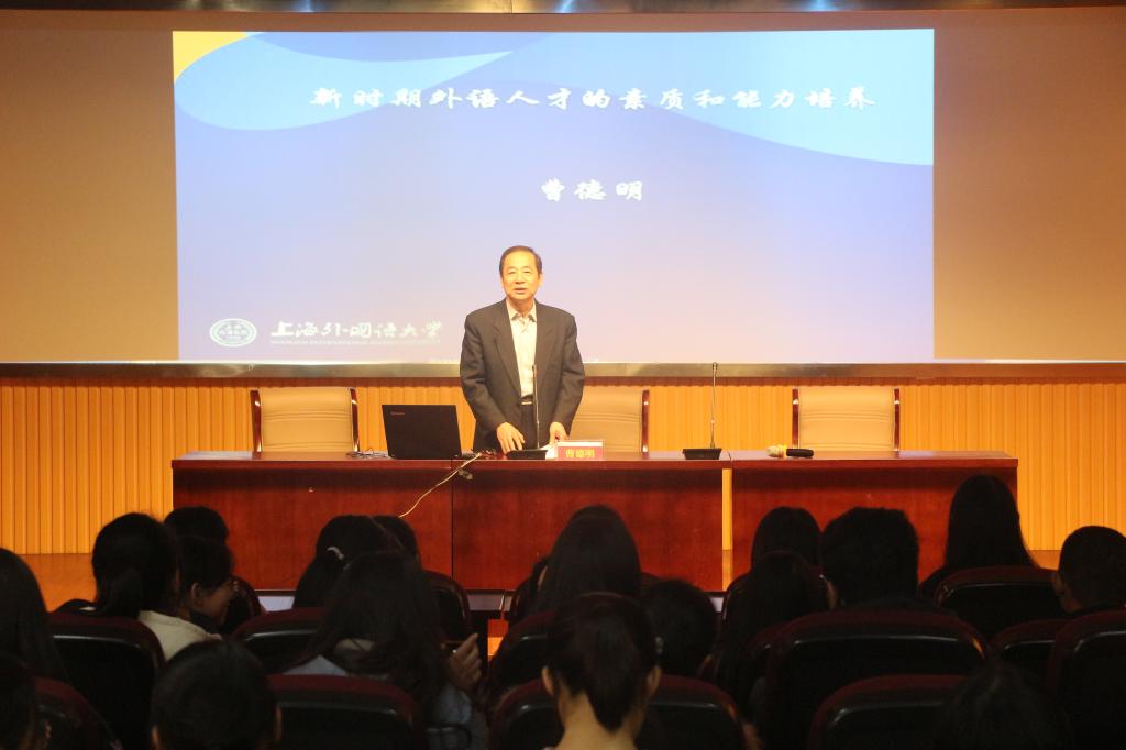 2019年11月28日下午,教育部外指委法语分委员会主任委员、中国法语教学研究会会长、上海外国语大学原校长、博士生导师曹德明教授应邀莅临我校讲学,为伟德victor1946师生作了一场题为“新时期外语人才的素养和能力培养”的学术报告,100余名师生聆听了讲座。讲座由王先荣教授主持。