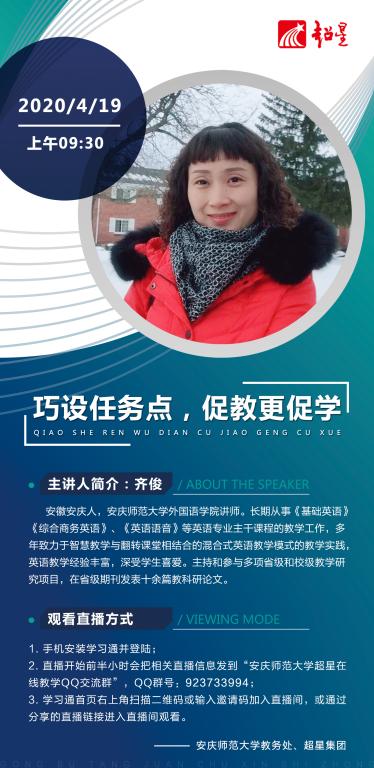 2020年4月19日,我院齐俊老师在线参加了由学校教务处和超星集团联合推出的线上教学交流经验分享活动,为全校教师带来题为“巧设任务点,促教更促学”的专题报告。