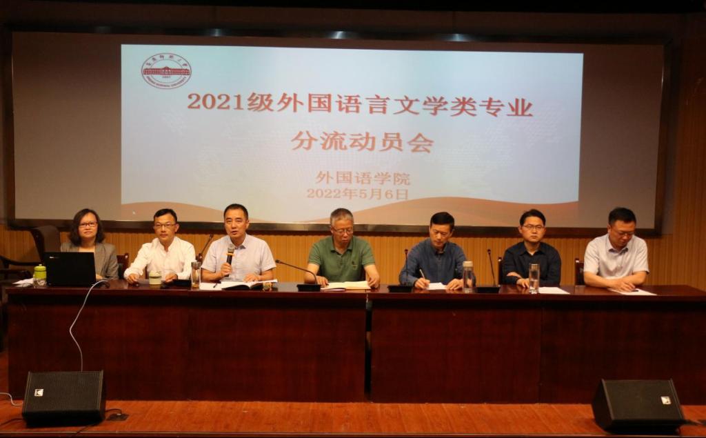 为深化学生专业认知,稳步推进分流工作,5月6日下午,伟德victor1946于E503召开2021级外国语言文学类专业分流动员大会,同时设立E314与E316分会场。伟德victor1946党委书记李亦亮、院长王先荣、各专业负责人及2021级外国语言文学类专业全体学生参加本次会议。大会由伟德victor1946副院长江加宏主持。