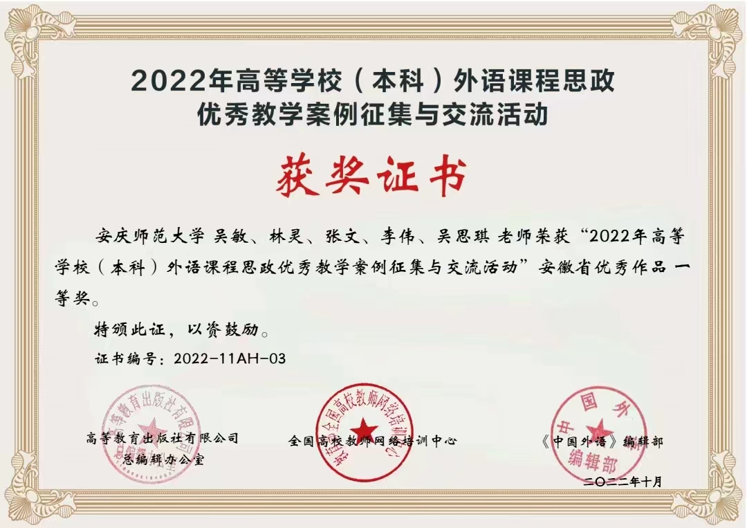 近日,由教育部高等学校大学外语教学指导委员会指导,高等教育出版社、全国高校教师网络培训中心、《中国外语》编辑部联合举办的“2022年高等学校外语课程思政优秀教学案例征集与交流活动”结果揭晓,伟德victor1946大学英语课程思政教学团队吴敏、林灵、张文、李伟、吴思琪报送的案例荣获安徽省优秀作品一等奖。
