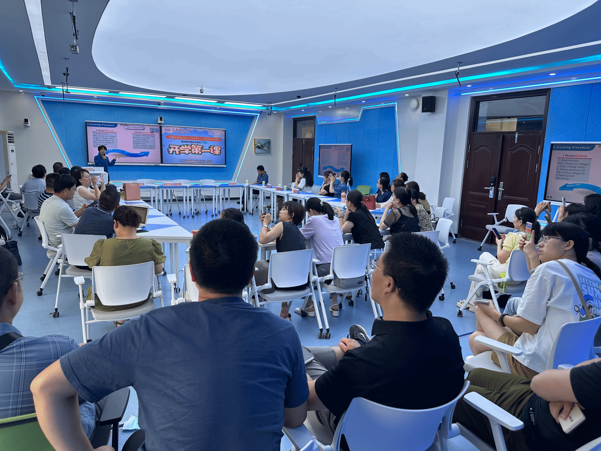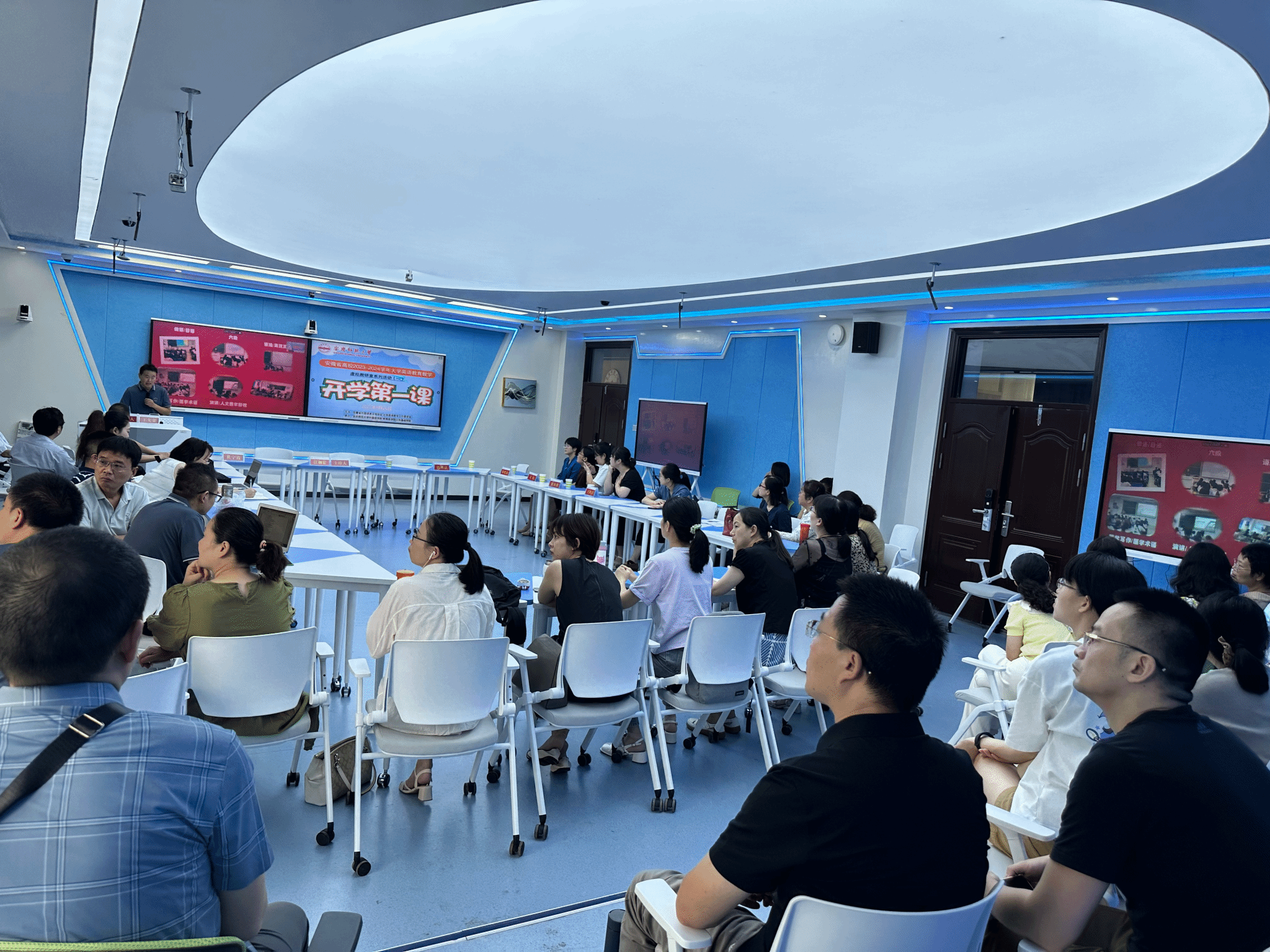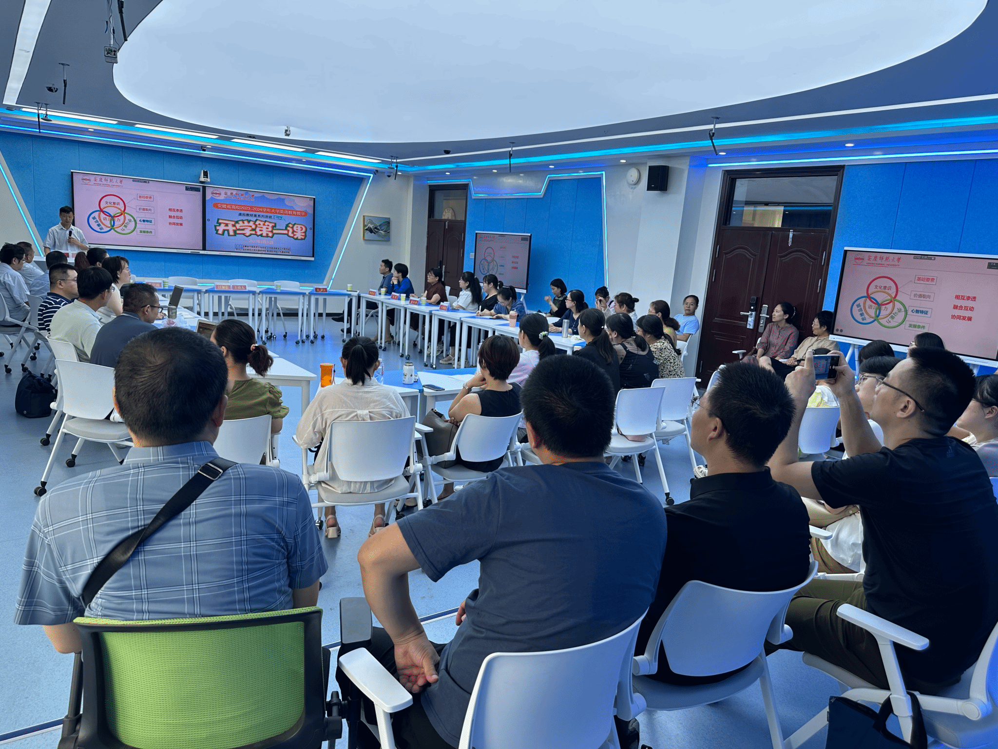 为深入学习贯彻习近平新时代中国特色社会主义思想,促进全省各高校之间的交流合作,推进全省大学英语教学改革与创新,8月27日上午,安徽省高校2023-2024学年大学英语虚拟教研室“开学第一课”教学研讨活动在我校文津楼智慧教室D204成功举办。此次活动由安徽省外文学会大学英语教学工作委员会主办,伟德victor1946和蚌埠医学院公共基础学院联合承办。大学英语教学工作委员会主任、伟德victor1946院长王先荣教授,工作委员会秘书长、蚌埠医学院公共基础学院外文教研室主任郭书法教授, 工作委员会副秘书长、伟德victor1946副院长瞿宁霞副教授出席研讨会议。伟德victor1946大学英语教学部全体教师线下参会,省内各院校200余名领导和老师在云端同步参与研讨活动。研讨会由工作委员会副秘书长、伟德victor1946副院长江加宏教授主持。