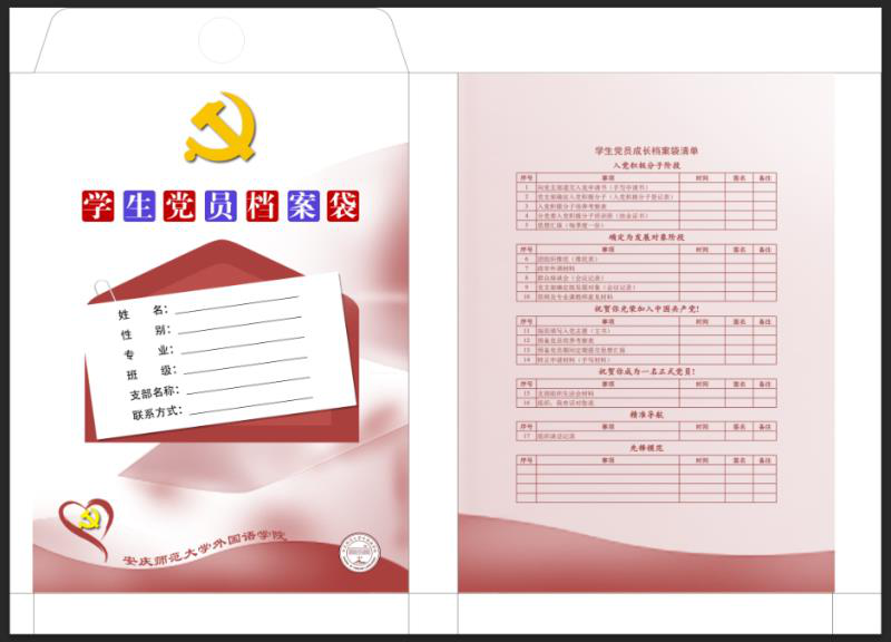 为落实全面从严治党,切实加强基层党组织标准化建设,严把党员发展质量、规范党员发展过程监督、强化党建档案制度管理,针对党建督查中暴露出的党员发展问题,伟德victor1946党委近期设计印制了“学生党员成长档案袋”。