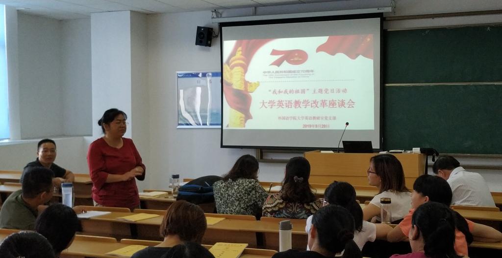 2019年9月29日下午,大学英语教研室党支部全体教师党员在E313举行了“我和我的祖国”主题党日活动。活动以“大学英语教学改革座谈会”为主题,畅谈近年来大学英语教学的改革和成果,抒发对中华人民共和国成立70周年来所取得的伟大成就的由衷自豪和对祖国的深切热爱之情。会议由大学英语党支部副书记江松强主持。