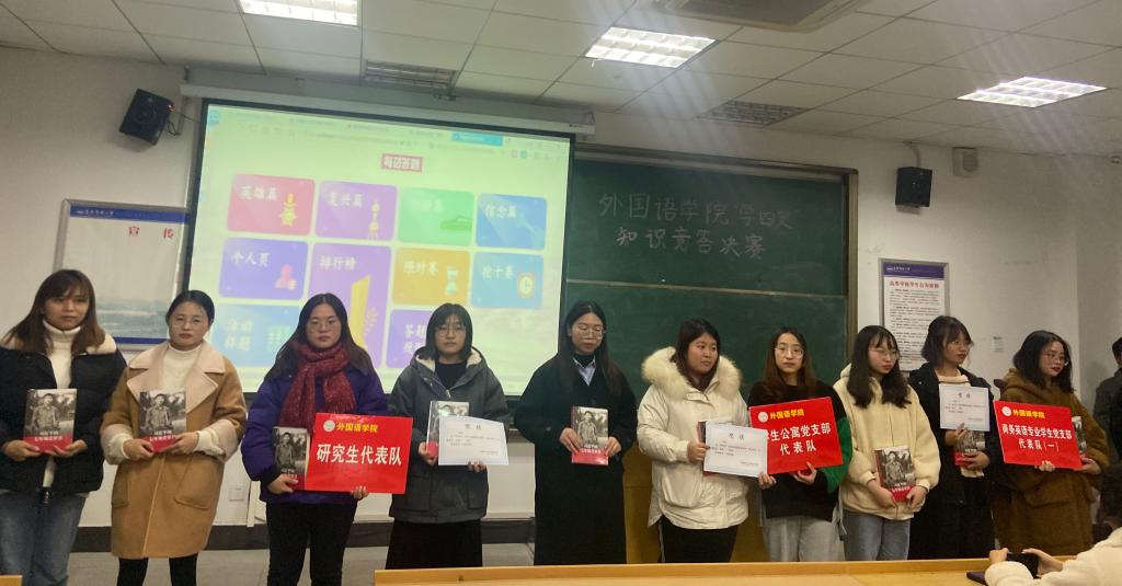 决赛共分为三轮,设置一等奖两名、二等奖三名和三等奖四名,答题题目从英雄篇、复兴篇、创新篇、青年篇四个板块中随机抽取,每篇20道题目。第一、二轮按答题正确率决出三支队伍进入第三轮,第三轮采取了抢答赛的形式,率先答对十道题的两支队伍将获得胜利。赛场上,选手们都积极表现,充分发挥各自智慧,努力为团队争取更高的成绩。比赛竞争激烈而不失乐趣,各代表队不仅展现了他们的能力,还体现出团队间的默契。经过激烈的角逐,最终新生代表队和英语专业学生党支部代表队荣获了一等奖。