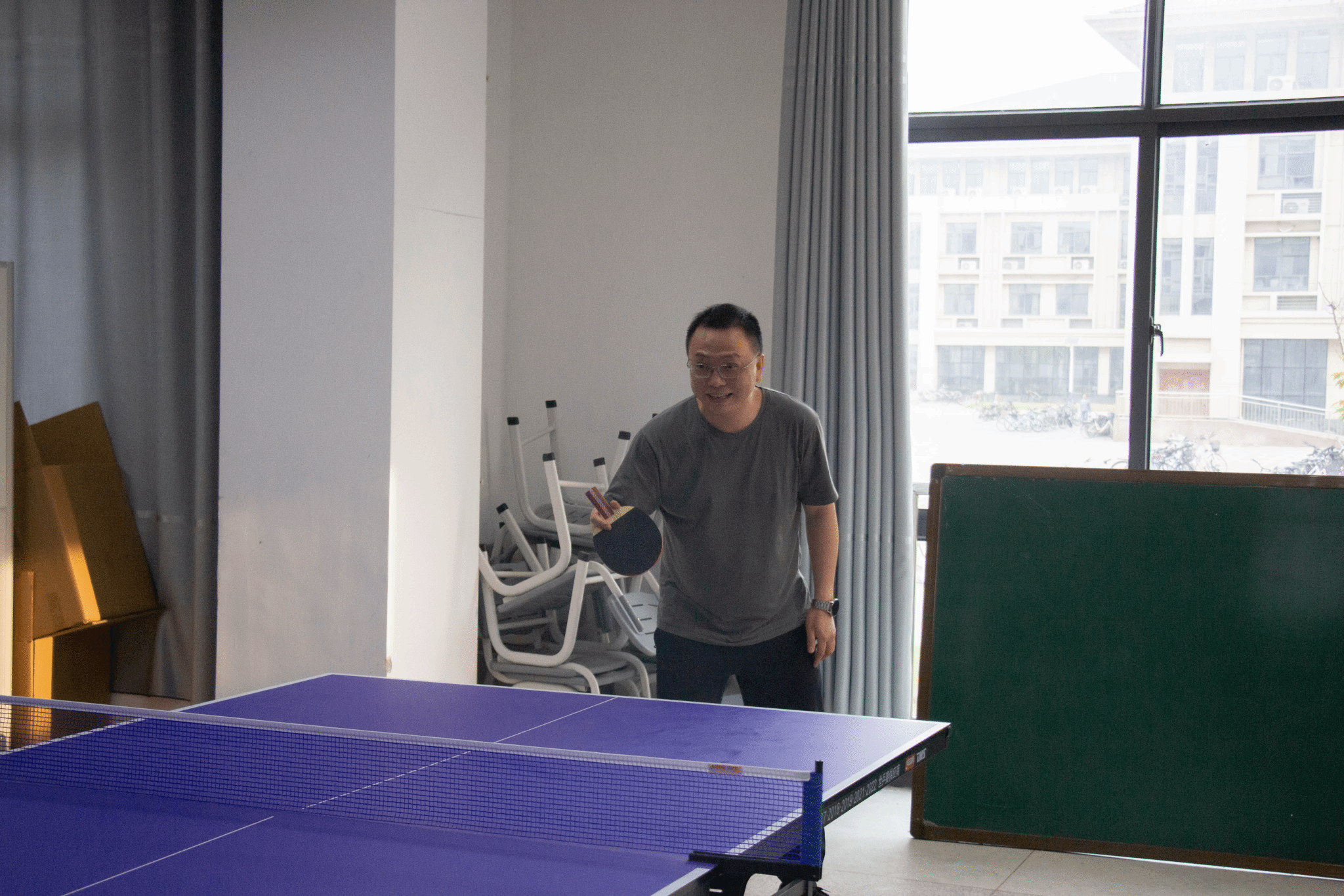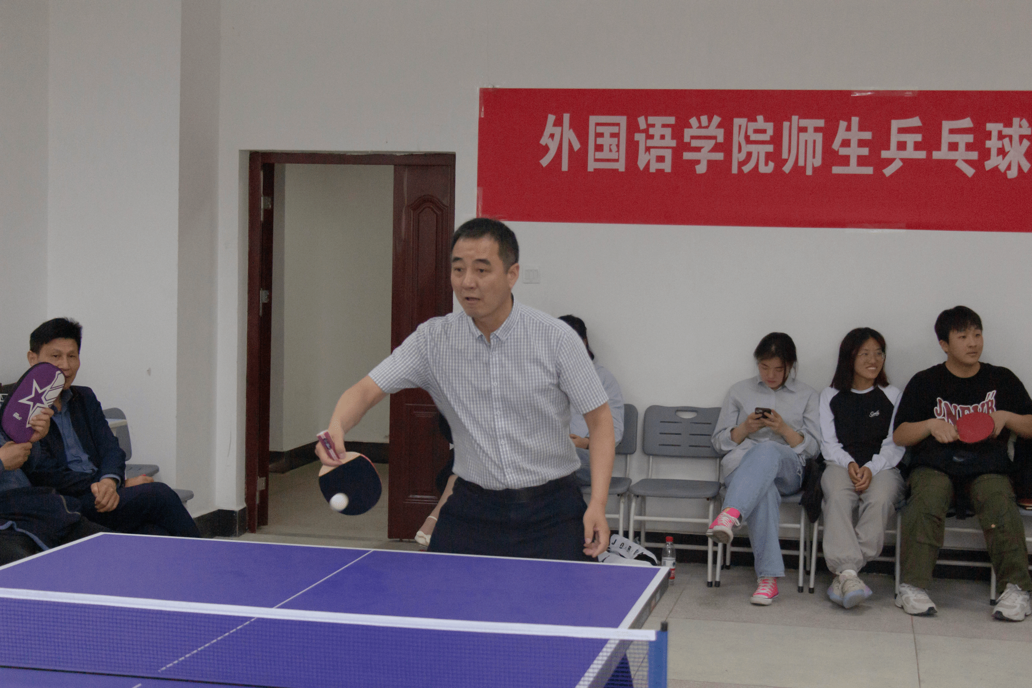 在工作人员的组织下,比赛秉承着公平、公正、公开的原则,热闹而又有序地进行。直拍、横拍、扣球、旋转球......老师与同学们认真专注,配合融洽,对拉、快攻、弧圈球等精彩场面频现,他们精彩的防守与绝杀博得现场观众们阵阵喝彩。比赛过程高潮迭起,充分展现了学院师生团结协作、勇于拼搏的精神面貌。