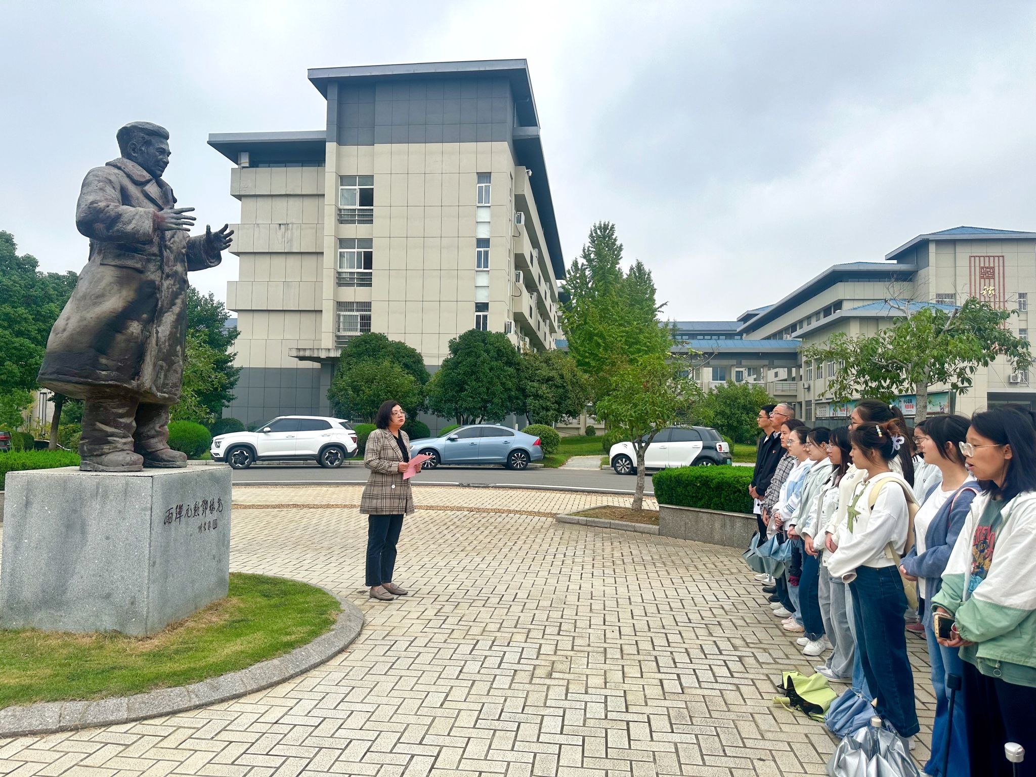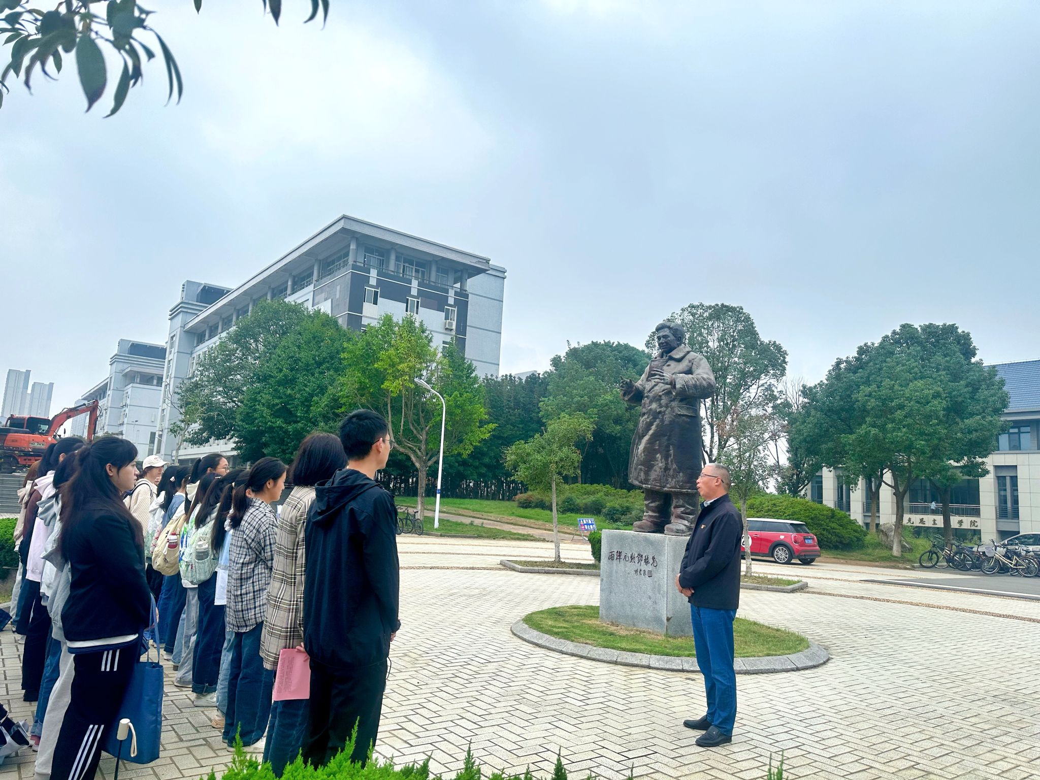 开班仪式结束后,学院开展了纪念邓稼先同志诞辰100周年主题党课宣讲,学院党委副书记何媛君带领培训班成员在“两弹元勋”邓稼先雕像前,开展了一堂生动的实践党课,从“求学”、“炮仗”、“攻关”、“核爆”、“元勋”五个故事回顾邓稼先的感人事迹和“两弹一星”精神。