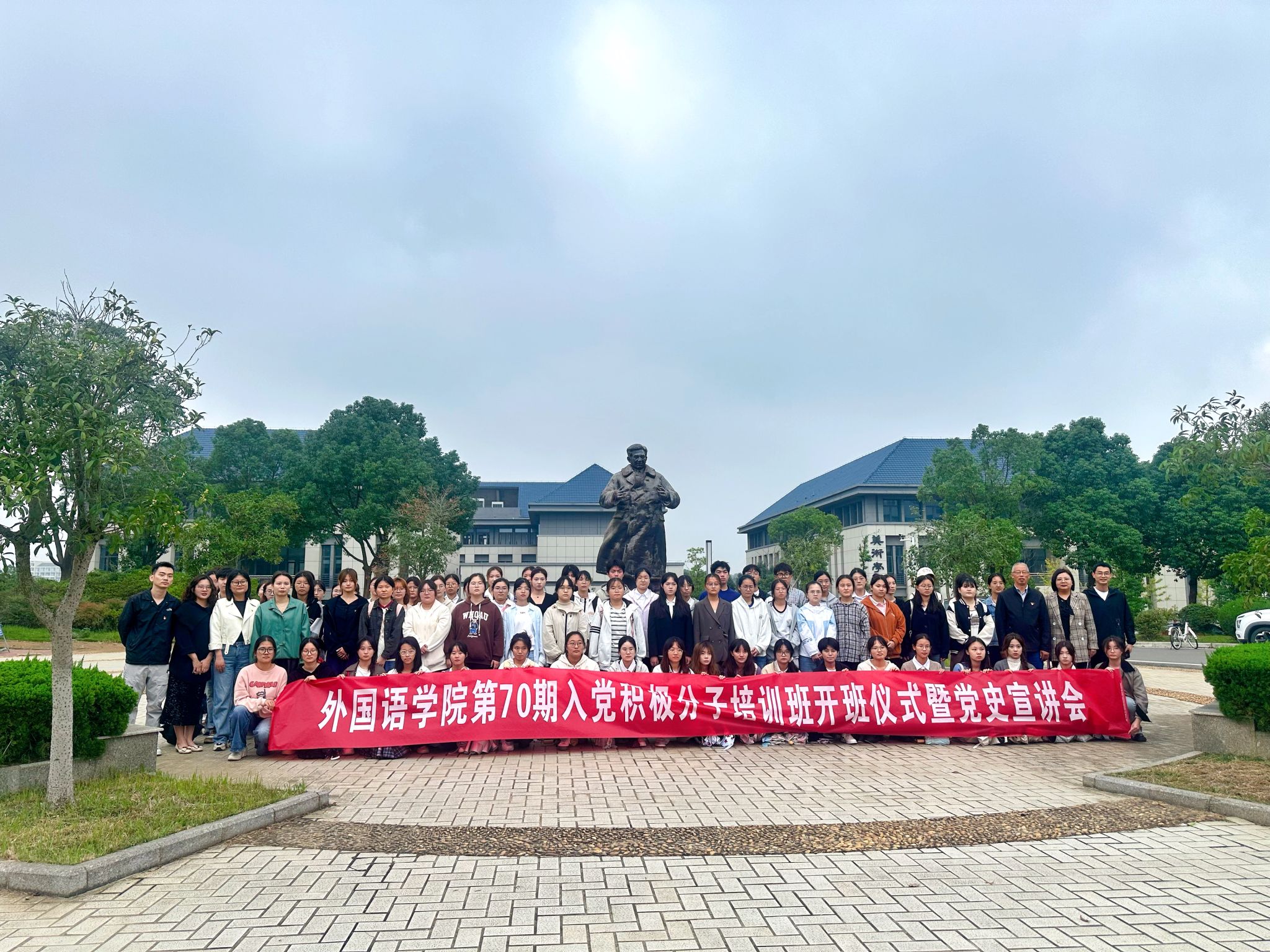 10月16日下午,伟德victor1946在稼先楼广场举行第70期入党积极分子开班仪式暨党史宣讲会,伟德victor1946党委书记李亦亮、党委副书记何媛君、学生党支部书记及第70期入党积极分子培训班全体成员参会。