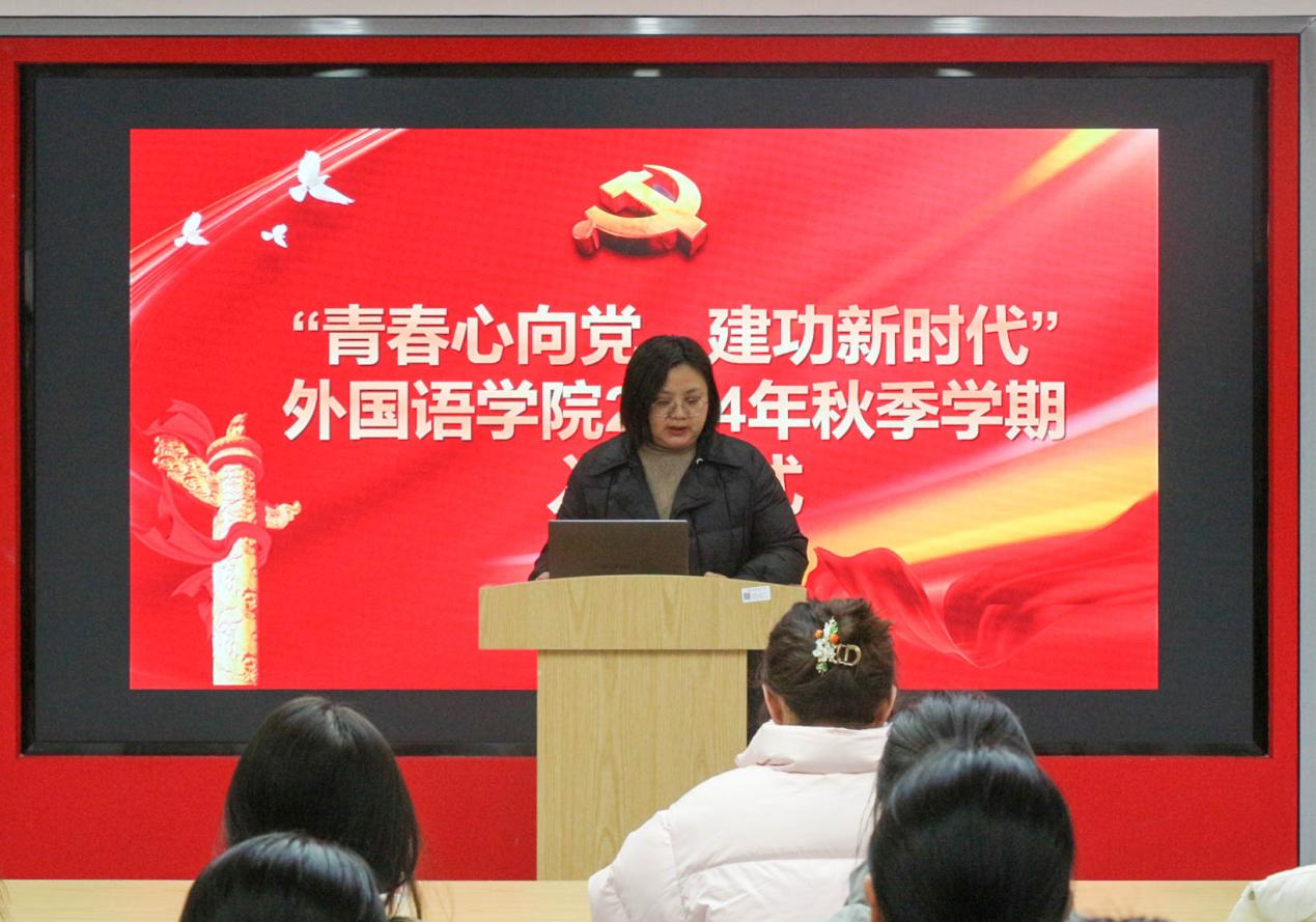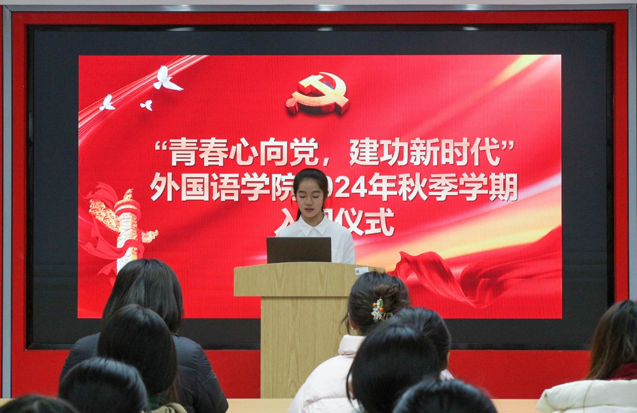 仪式在庄严的国歌声中拉开帷幕。何媛君向学院新发展团员表示热烈祝贺。她指出,入团是人生道路上的新起点,学院优秀团员、团干要在不断进步中带领全院青年学子共同拼搏进取,成为更优秀的外语人才。同时,她对全体团员青年提出几点希望:要勤于学习,做有理想的时代青年;要勇于负责,做敢担当的时代青年;要吃苦奋斗,做有作为的时代青年;要博学善行,做知行合一的时代青年。将自己的人生追求与人民的需要紧密相连,让青春在为祖国、为民族、为人民的不懈奋斗中绽放绚丽之花。