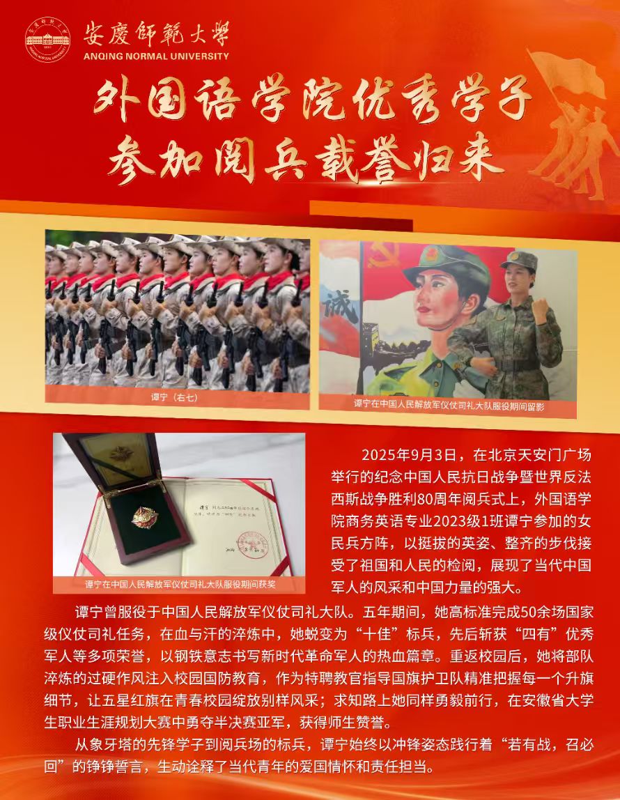 伟德victor1946将思想政治教育与爱国主义教育融入迎新环节,将商务英语2023级专业(1)班谭宁同学参加“9·3”大阅兵的光荣事迹以图文并茂的形式制成专题展板,生动展现学院学子昂扬向上的精神风貌。展板内容包括在天安门广场受阅瞬间、在中国人民解放军仪仗司礼大队服役期间的经历及所获荣誉等。谭宁表示,军队经历培养了她的纪律性和责任感,而校园生活则给予她专业知识和综合素养;她希望将来能发挥语言专业优势,结合军队经验,在外事交流或国际传播领域为国家作出贡献。