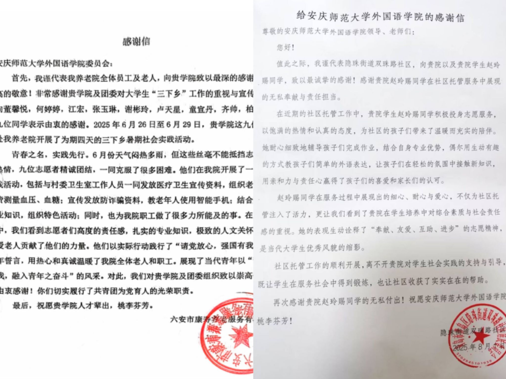 由董馨悦、何婷婷、江宏、张玉琳、谢彬玲、卢天星、童宜丹、齐帅、柏跃宇这九位同学组成的赴安徽省六安市金安区银龄关爱暑期社会实践团在当地开展了一系列实践活动,包括与村委卫生室工作人员一同发放医疗卫生宣传资料,组织老年人免费测量血压、血糖:宣传发放防诈骗资料,教老年人使用智能手机:结合英语专业知识,组织特色活动等。当地部门在表扬信中指出,“他们以实际行动践行了‘请党放心,强国有我’的青年誓言,展现了当代青年以‘青春之我,融入青年之奋斗’的风采。”