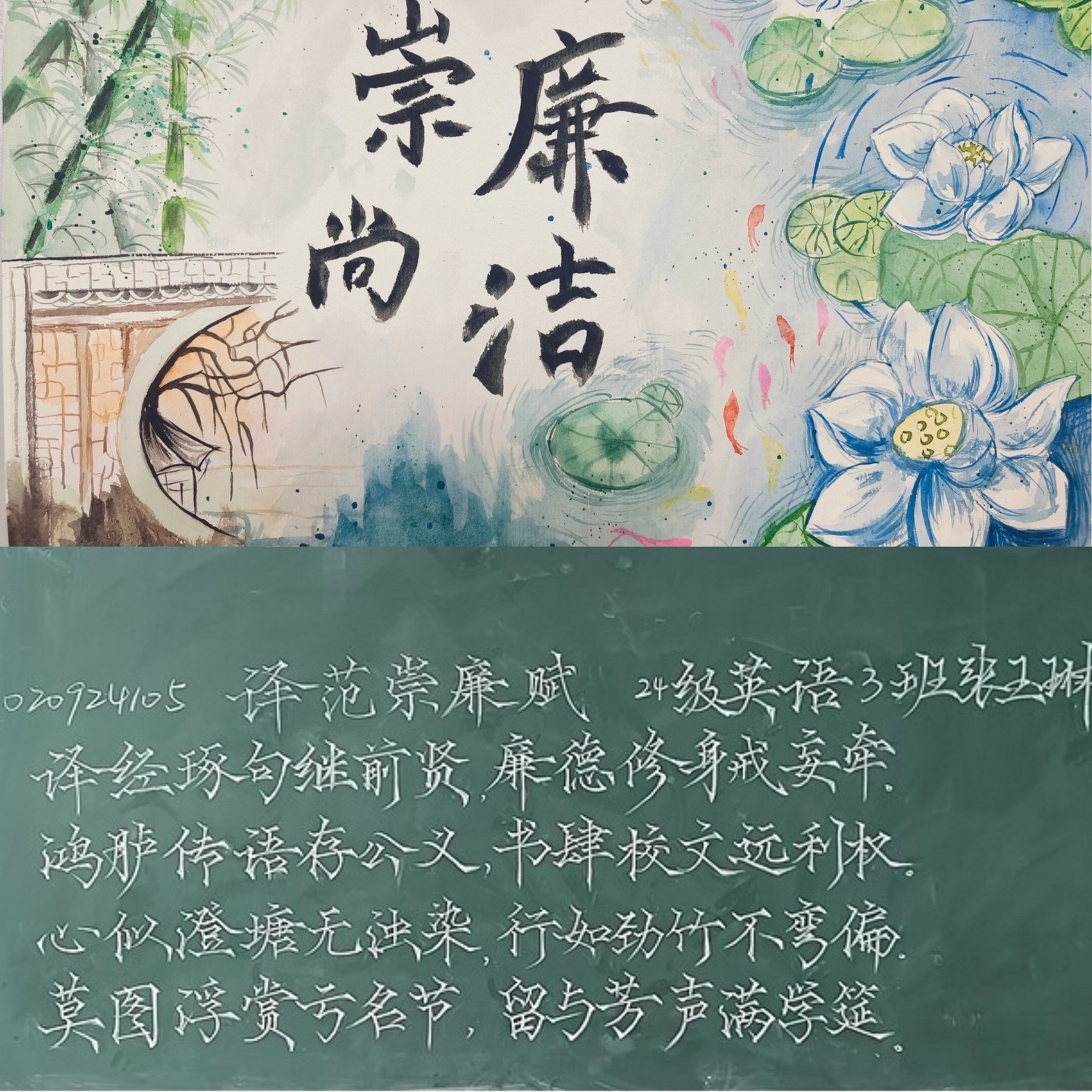 本次比赛以“译润初心,廉润外院”为主题,紧密对接师范生培养核心要求,围绕廉洁文化教育设置钢笔字、毛笔字、粉笔字及简笔画四项赛程,采用分类开展的形式——粉笔字、毛笔字为作品征集,钢笔字、简笔画为现场书写。粉笔字作品中,一行行整洁工整、遒劲有力的字迹尽显功底,充分展现了未来教师“三尺讲台”的书写素养;毛笔字作品或端庄秀丽,或潇洒飘逸,点横撇捺间传递着中华文字艺术的独特魅力;钢笔字书写现场,同学们端坐凝神、笔锋稳健,在纸面之上勾勒汉字韵味,于笔墨挥洒中锤炼师范技能;简笔画书写区同样精彩纷呈,参赛者围绕给定主题巧妙构思,仅用寥寥数笔便将生动的教学场景、可爱的卡通形象栩栩如生地呈现出来,体现了未来外语教师将视觉元素融入课堂的创意与潜力。