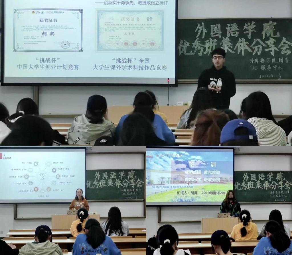 为进一步发挥优秀班集体的引领示范作用,提升班级凝聚力,引导班级明确创建目标和发展方向,4月13日下午,伟德victor1946于E107举办优秀班集体分享会,特邀请2021年度校十佳班集体2018级英语1班、先进班集体2019级商务英语1班、2019级翻译2班的班委们分享经验,2021级全体班委到场聆听。