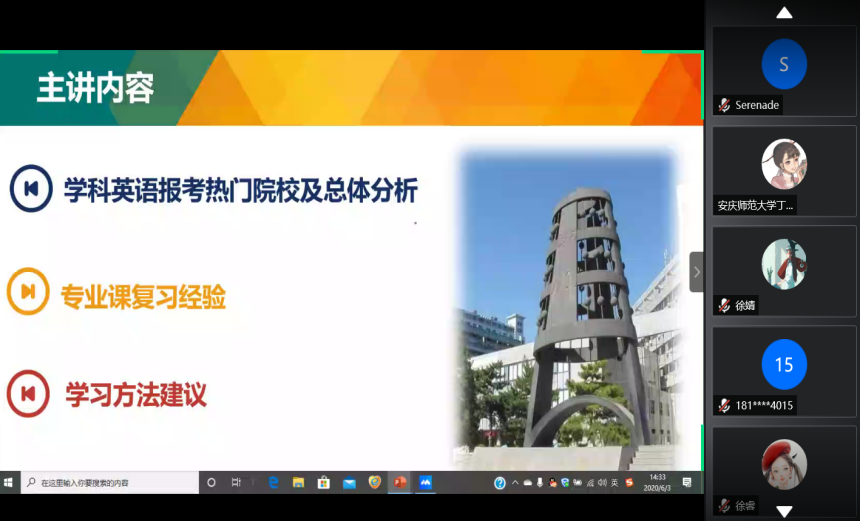 为帮助学生更好地了解考研形式,明确考研规划,掌握备考技巧,6月3日下午,伟德victor1946依托线上平台成功召开了考研经验交流会,11位2016级学生代表及300余名学生参加了此次会议。