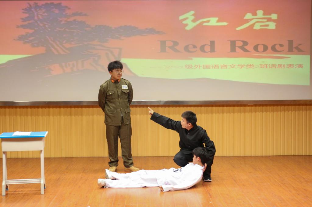 一首监狱中写下的《我的“自白”书》、一面手绣的五星红旗、一场不畏牺牲的英勇就义……外国语言文学类专业2021(2)班则选择了红色长篇小说《红岩》中的三个经典片段,演绎了中国共产党人为革命事业而与反动派分子开展的激烈斗争。“将红色革命经典翻译成英文是一件不容易的事情,但你们翻译的很棒,角色的演绎也十分出色,我很喜欢这则话剧。”外教Doung West点评到,他被“江姐”这位角色所展现的坚贞不屈的大无畏精神所深深感染。