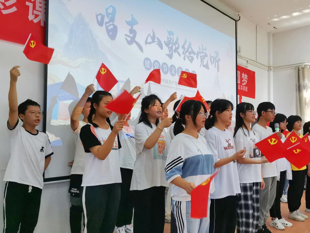 文艺汇演在开场舞《我们是共产主义接班人》中拉开序幕,欢快的节奏,自信的笑容,吸引着观众的目光。“唱支山歌给党听,我把党来比母亲……”师生大合唱《唱支山歌给党听》一出场就点燃了气氛,学生们手持党旗,悠扬的歌声诉说着对党的深情。“少年强则国强,少年自由则国自由”学生们字字铿锵的朗诵搭配老师浑厚响亮的歌声,为观众呈现了一场视听盛宴。伴随悠扬悦耳的琴音,一首钢琴独奏《灯火里的中国》缓缓流入观众耳朵中,以百姓的视角展现中华民族的国泰民安。原创心理情景剧《我是谁》紧跟学生中考现状,通过独白、梦境、对戏等形式讲述了一位农村女孩刚进入高中时,从自卑到自信的故事,剧目用朴实无华的语言,生动形象的表演,给人以感人至深的力量。实践团队员带来的朗诵《我和祖国》情绪激昂,抑扬顿挫间歌赞祖国锦绣山河。相声《小偷公司》以贴近学校生活的内容和风趣幽默的语言获得了在场观众的喝彩。古典舞《万疆》以柔美的舞姿展现祖国大好河山的魅力,用舞姿表达自豪与热爱。