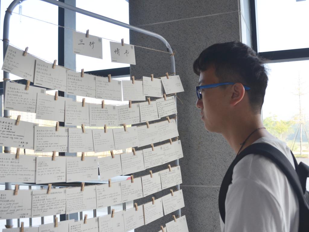 活动展示现场十分热闹,不少师生在展板前观看讨论。传媒学院广播电视学专业2019(2)班的赵维俊路过时表示,早就注意到展示的海报,欣赏了许久,“我最喜欢的是‘我爱这世间的所有,爱一切美好的存在与发生,而我最爱的还是你的万里山河’,从中可以感受到这个作者一定是个既热爱生活,更热爱祖国的人,很有感触。”