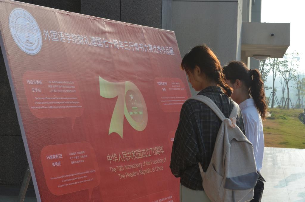 正值新中国成立七十周年,伟德victor1946面向全校学生征集汉英双语“三行情书”,以此特殊的方式号召同学们抒发心中对祖国的爱意,传播爱国主义正能量。最终,有来自各个学院的346份作品经过预选和评委打分,裁决出一等奖2名、二等奖7名、三等奖12名,其中15份优秀作品被制做成海报在伟德victor1946门口展出,吸引了大批师生驻足观看。王梦怡说出了自己参加活动的感受:“思索了很久,最终想到这三句话,虽然简单,但真切表达了我对伟大祖国的爱。”