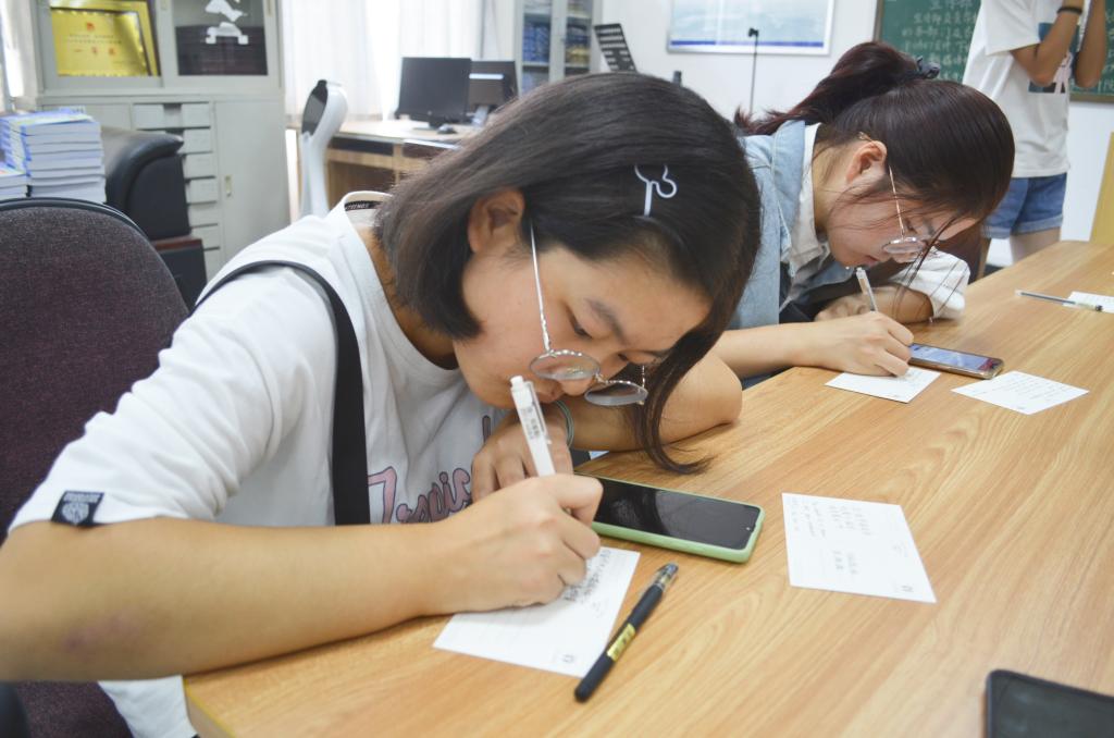 “一笔,书不尽峥嵘岁月万古江河,双语,倾不尽赤子热忱四方情深,三行 展不尽泱泱华夏盛世风光。”伟德victor1946一楼大厅里,来自2019级法语专业的王梦怡正趴在桌上书写这几句情话,在她周围坐着的同学同样奋笔疾书,书写心中的柔情。