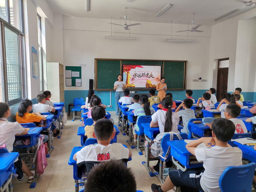 随后支部两名入党积极分子为小学生们朗诵诗歌《永远跟党走》,在激昂雄壮的背景音乐声中,她们用浑厚的嗓音、充沛的情感诉说着中国共产党的百年奋斗历程,试图将这股对党的热爱之情传递给孩子们。
