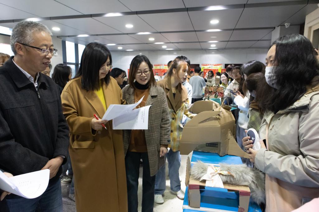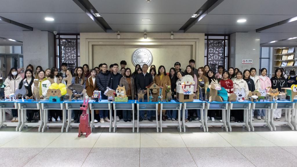 各种造型各异的纸箱小狗整齐摆放在桌子上,有的“主人”现场表演遛狗,引得学生纷纷驻足拍照,更有学生提出想要领养一只宠物狗。外国语言文学类2022(4)班的黄丽娟便是其中一员,她表示,由于缺乏材料,自己一直没能亲手制作纸箱狗。“感觉大家的作品非常棒,有机会的话,我也要做一只纸箱狗!”