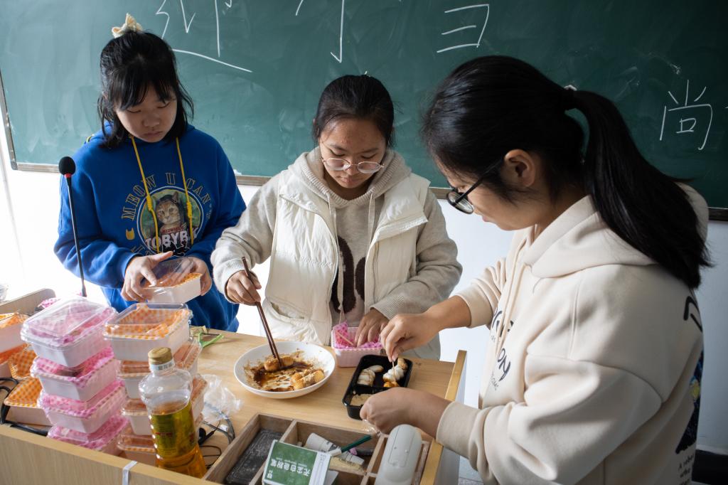 “不要注入太多水,不然面团不成形!”“揉丸子时要注意力道,不要揉散!”……英语专业2021(7)班的晋丽娜化身为“小老师”,不时在旁提醒着注意事项。谈及选择制作紫薯丸子的缘由,她表示,紫薯丸子是人们在小雪节气期间经常吃的食物,可以作为标志性食物,让学生从食品方面了解小雪,而且紫薯丸子制作过程较为简单,易于学生上手操作。