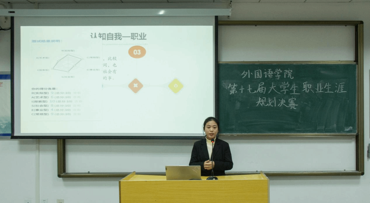 比赛分为职业规划展示、现场答辩、评委点评三个环节。选手充分发挥出个人主观能动性,根据SWOT、MBTI、霍兰德职业兴趣测评等专业测评工具对自己进行精准定位,客观透彻地从自我认知评估、职业探索规划、环境评估分析、未来计划执行四个方面做出职业定位与评估调整,并合理提出职业生涯规划,详细阐述了各个阶段的目标和实践方案。他们富有激情的演讲、幽默生动的语言,深深感染了在场的观众,并得到了评委的一致好评,充分表达出选手们扎实的专业知识和对末来蓝图的认真规划。