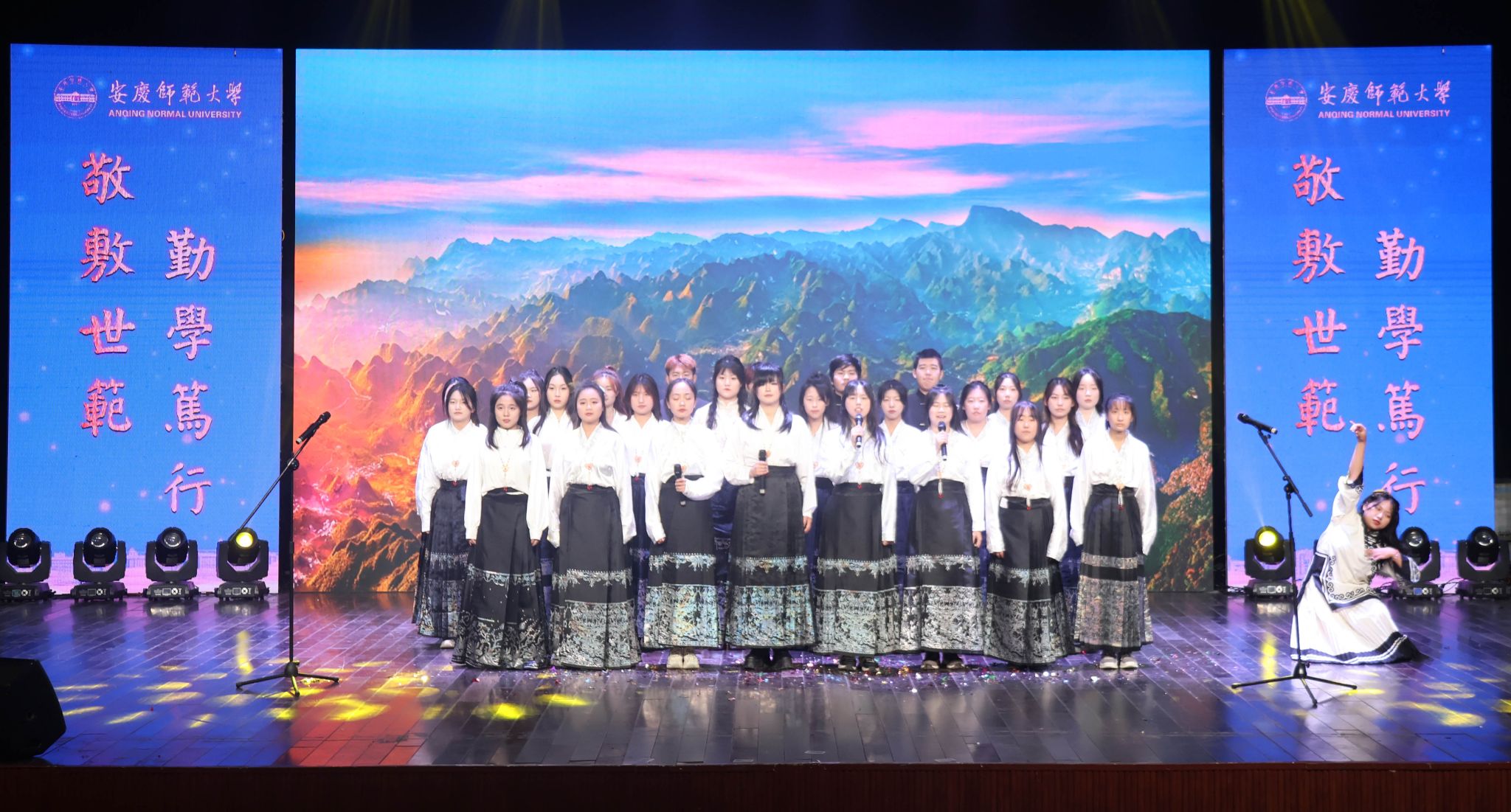 本次晚会以“思风华外院,书时代青春”为主题,分为“薪火相传——遇见外院”“韶华不负——启航外院”“星辰大海——筑梦外院”三个篇章,涵盖13个节目,7种艺术表演形式。“提前两个月进行晚会策划,通过3轮海选审核,最终筛选出最具吸引力的节目。”晚会负责人、英语(师范)专业2022(2)班的樊一景表示,整体活动流程时间跨度较长,每个节目都预留了充分的准备时间,为将前期的努力化作最好的结果,呈现最完美的舞台效果。