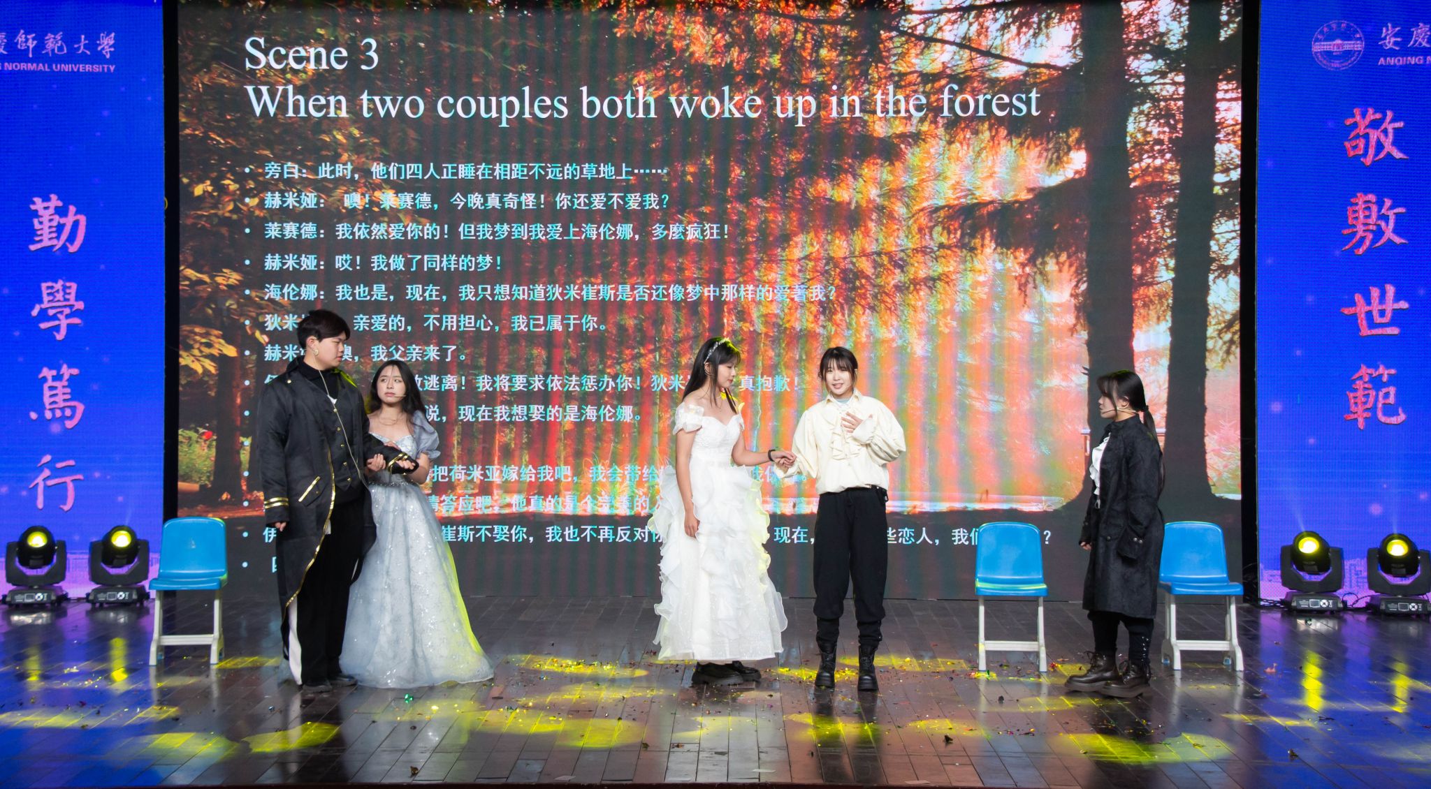 “今日痛饮庆功酒,壮志未酬誓不休。”说唱《庆功酒》热血沸腾,字字传达出激情豪迈之势;学院礼仪队带来的文化展示《东方之珠》韵味十足,尽情彰显了“故事满满”的港风文化;优雅而富有节奏感,舞步轻盈而有力,学院拉丁舞团向观众展现了热情如火的拉丁舞魅力;铿锵有力的朗诵《青春正当“燃”》结合伟德victor1946学子在暑期三下乡中的优异表现将学子们的青春光彩纵情绽放;精美绝伦的外文话剧《仲夏夜之梦》通过紧张的故事情节、精湛的台词演技将观众带到了他们的世界中,同悲同喜,感人至深;由法语专业师生合唱团带来的法语版歌曲《我和我的祖国》以良好的台风、自然大方的表演状态赢得了在场观众的阵阵掌声……