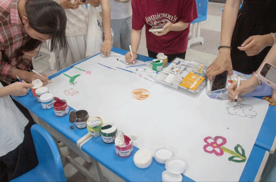 “可以画向日葵!”“这里还有空隙!”“小猪代表我可爱的朋友。”……参与学生在绘制过程中的欢笑声不断。外国语言文学类专业2023(9)班的李仕菊将蜜蜂、太阳和向日葵画在画布上。“对我而言,这些元素意味着爱和未来,希望能为更多人带去鼓励和支持。”