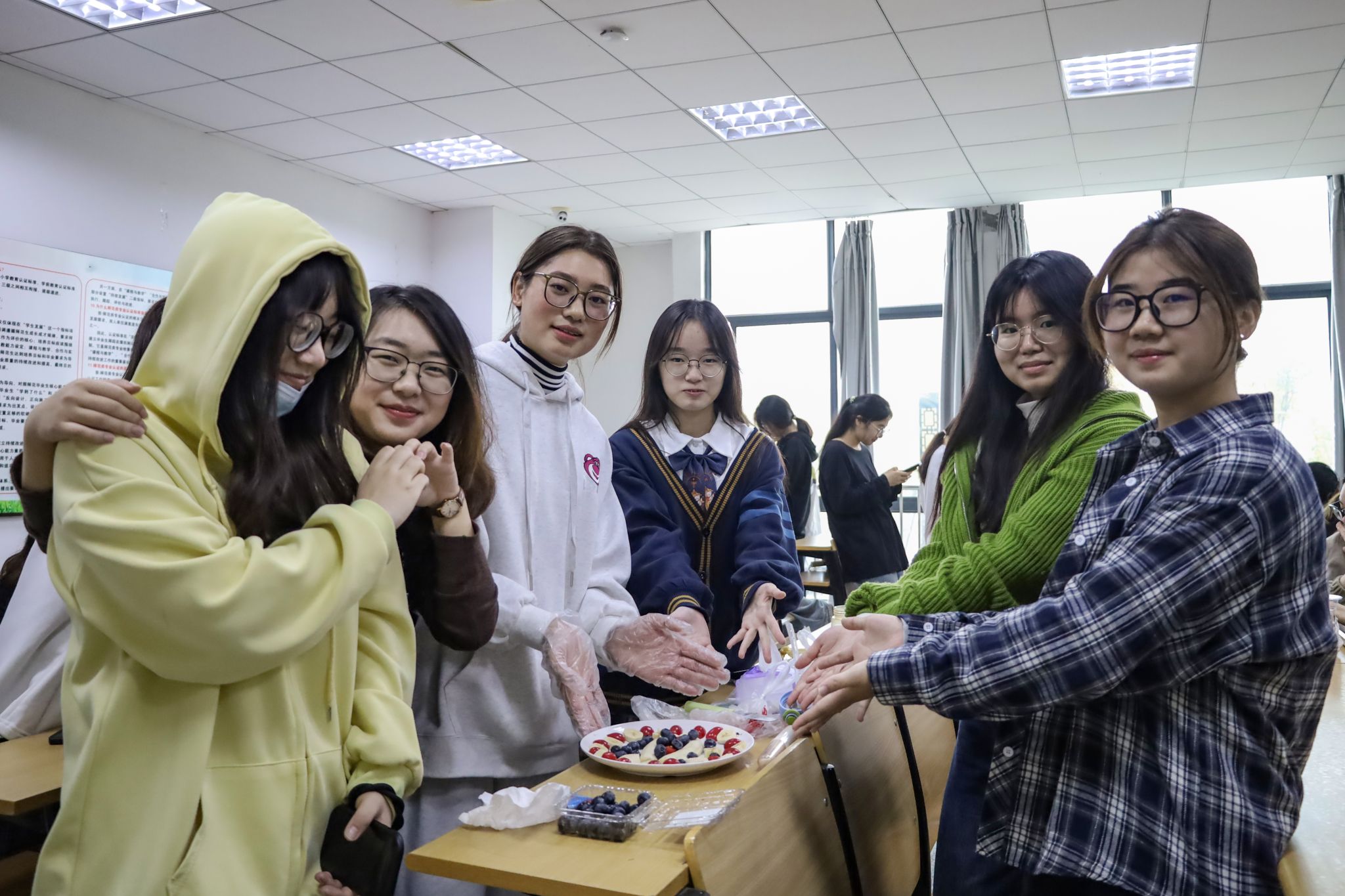 “每三到六人作为一组,每一组都有半个小时的准备时间,离终场十五分钟时,每五分钟,提醒一次。根据主题创意、整体造型、色彩花样、卫生处理四个方面对作品进行打分。”裁判宣布着规则。11月16日,伟德victor1946在E104教室和E106教室举办创意水果拼盘比赛,150余名学生参与比赛。